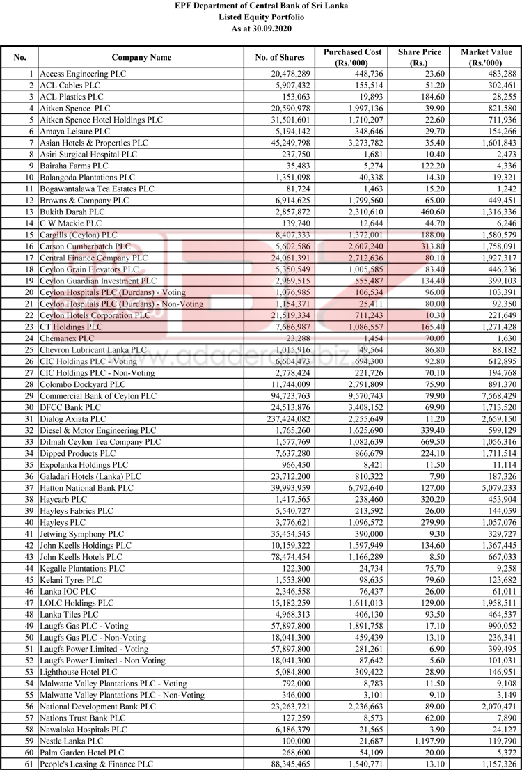 ඒ අනුව 2020 සැප්තැම්බර් 30 දිනට සේවක අර්ථසාධක අරමුදල විසින් ලැයිස්තුගත සමාගම්වල කර තිබෙන ආයෝජනයන් හි උපලබ්ධි නොවූ අලාභය රු. බිලියන 20.64 ක් වේ.